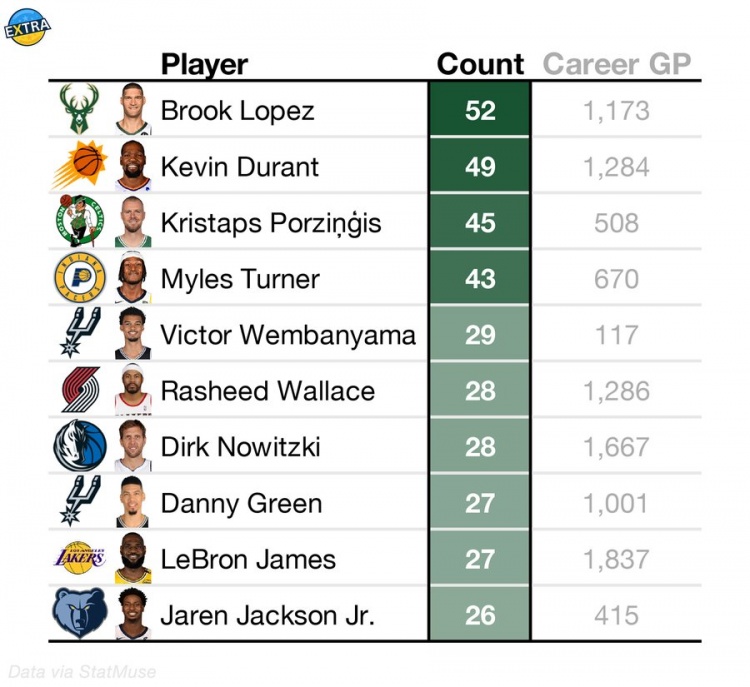 2025-03-14 20:09:04大洛第52次3+帽3+三分 歷史第1 文班僅用117場(chǎng)就29次 位列第5