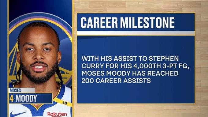 比賽第三節(jié),穆迪助攻庫里命中本場第2記三分,后者正式突破4000記三分神級大關(guān),而這也是穆迪生涯的第200次助攻!