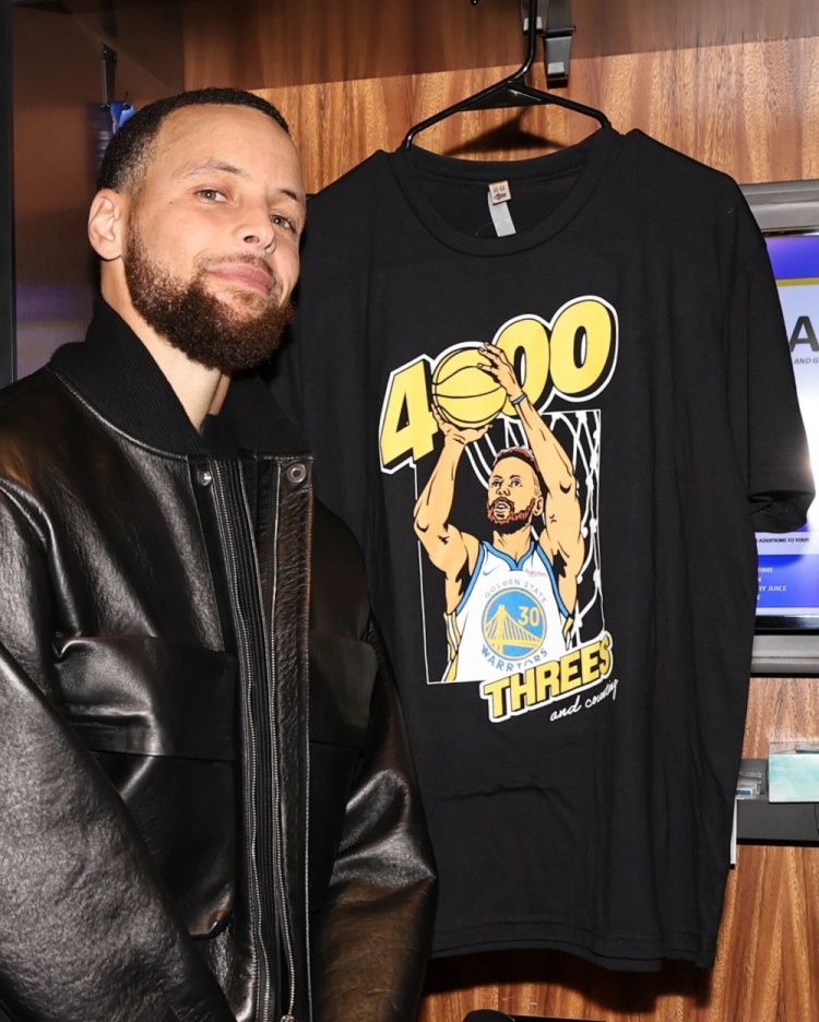 賽后NBA官推曬出了庫(kù)里穿皮衣與4000三分T恤合照,并寫道:Mr.4K(4000三分先生)!