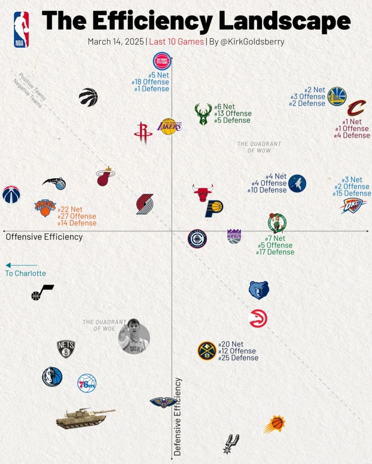 2025-03-15 07:41:23近10場(chǎng)攻防效率:騎士與活塞分別領(lǐng)銜攻防 勇士攻防均排名前三