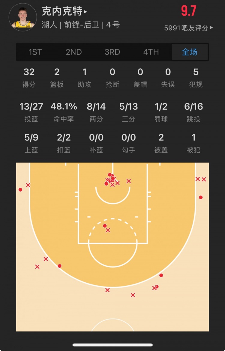 湖人17號秀 道爾頓-克內(nèi)克特 登場36.9分鐘