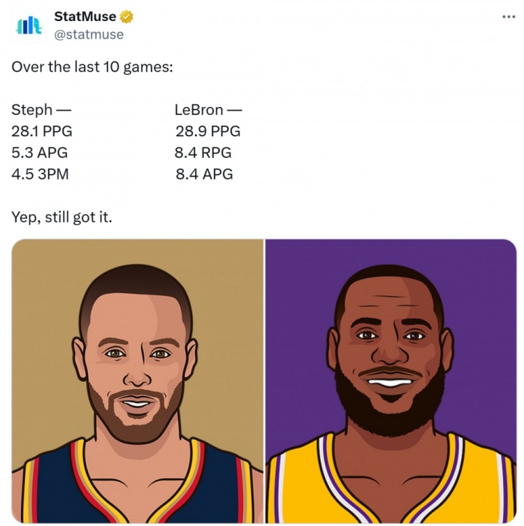 2025-02-25 00:27:07寶刀未老!近10戰(zhàn)庫里場均28.1分&進4.5三分 詹姆斯28.9+8.4+8.4