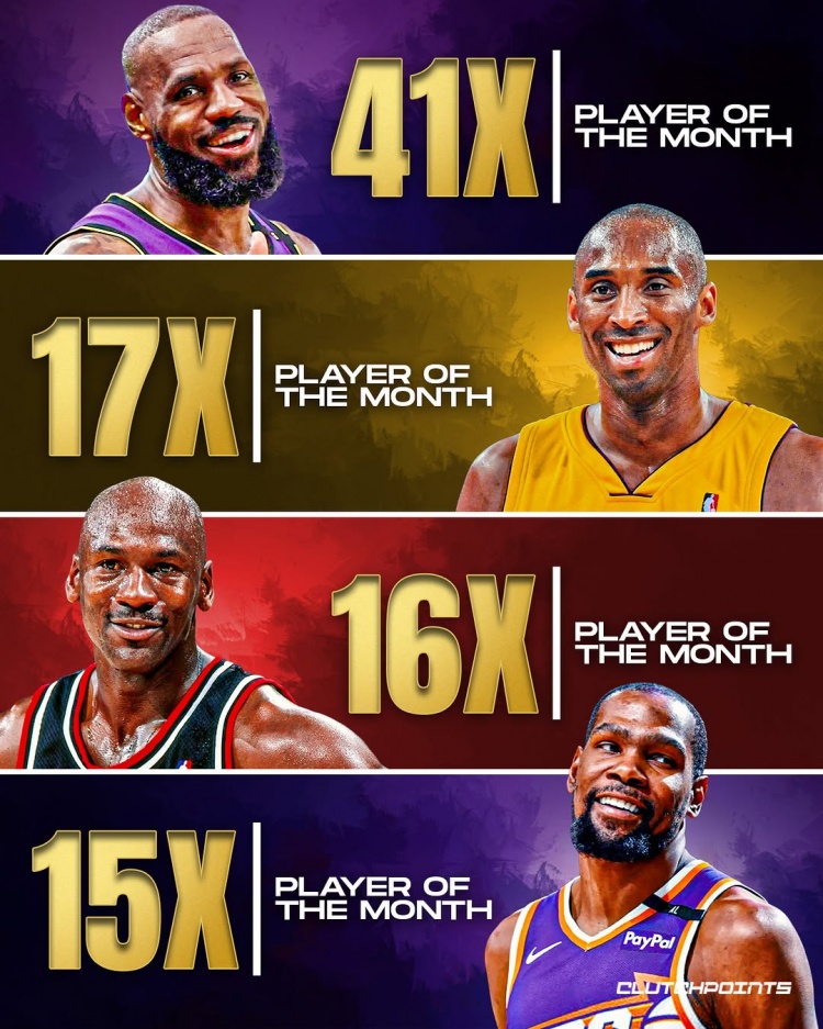 2025-03-17 10:55:52詹姆斯41次月最佳歷史斷檔第一 科比17次第二 喬丹16第三KD15第四