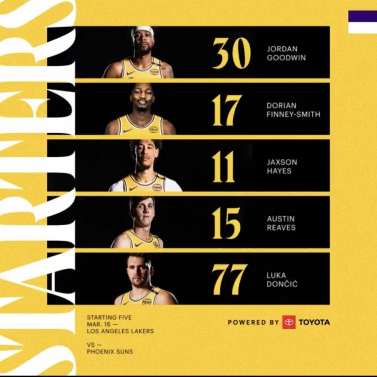 湖人首發(fā):東契奇 里夫斯 古德溫 芬尼-史密斯 海斯
