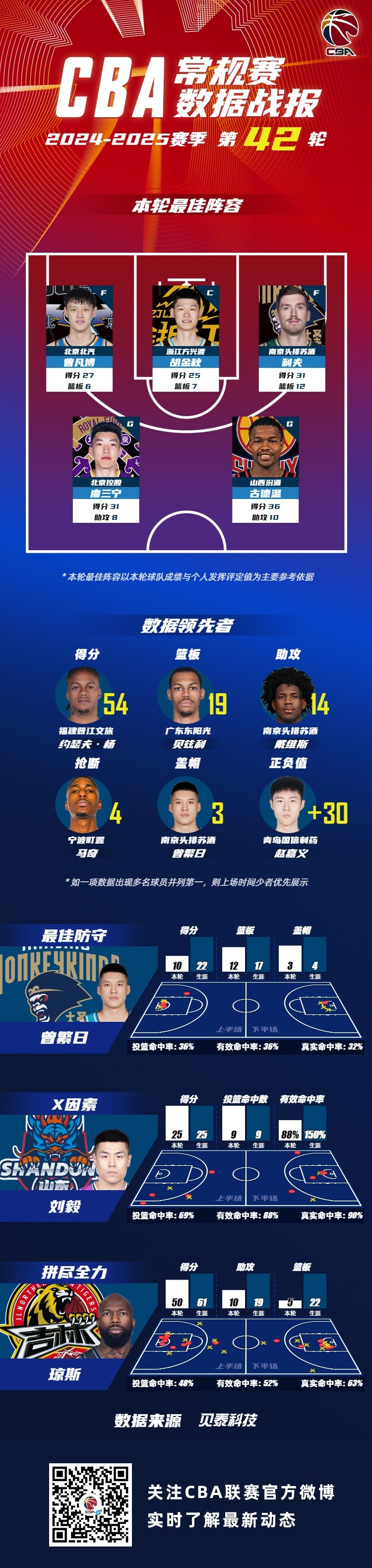 2024-2025賽季CBA聯(lián)賽常規(guī)賽第42輪結束較量,來自北京首鋼籃球俱樂部的曾凡博 ,浙江廣廈籃球俱樂部的胡金秋,南京同曦籃球俱樂部的利夫,北京控股籃球俱樂部的廖三寧和山西汾酒職業(yè)籃球俱樂部的古德溫入選CBA聯(lián)賽常規(guī)賽第42輪最佳陣容!