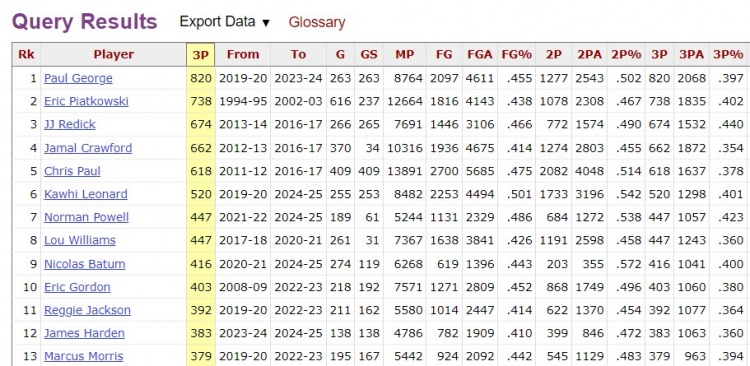 目前排在鮑威爾前面一位的是萊昂納德,520記三分。