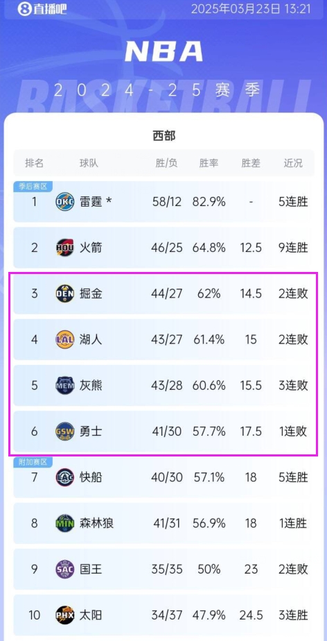 西部第3的掘金、第4的湖人、第5的灰熊和第6的勇士最近都在輸球;第7的快船打出5連勝,森林狼位居第8,兩隊都和第6的勇士(季后賽直通區(qū))只差0.5個勝場;第2的火箭豪取一波9連勝穩(wěn)住目前的排位;雷霆此前已經(jīng)鎖定西部第一的位置。