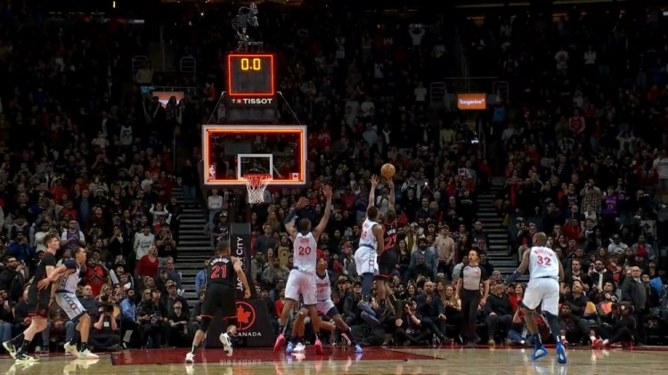 奇才隊(duì)垂頭喪氣地站在一旁,希望裁判的審查能取消這個(gè)進(jìn)球。當(dāng)裁判做出裁決——謝德在時(shí)鐘指向0:00時(shí)仍有兩個(gè)手指觸球——奇才隊(duì)高興地跳了起來,猛龍隊(duì)從興奮變?yōu)檎痼@,噪音從喧鬧變?yōu)槔Щ蟮牡驼Z。