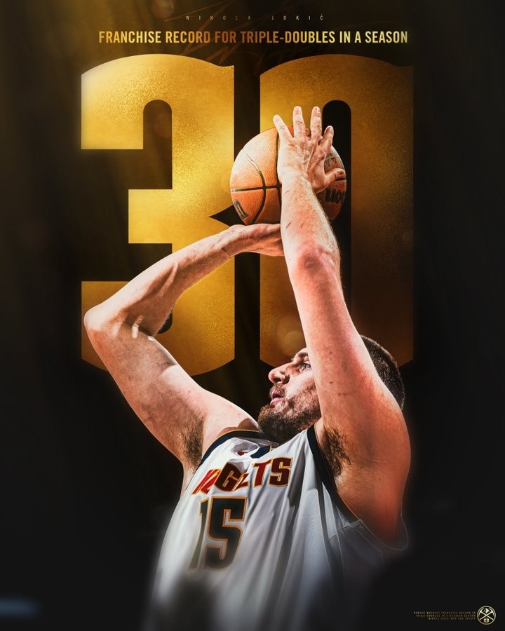 2025-03-27 20:42:30打破自己保持的隊史紀錄!掘金官方曬海報:約基奇單季30次三雙!