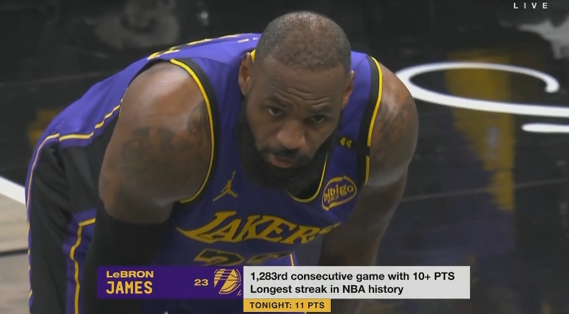 2025-03-27 20:57:01雖遲但到!詹姆斯第四節(jié)開局連得8分連續(xù)1283場比賽得分上雙!