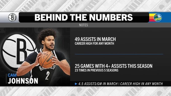 轉(zhuǎn)播方曬出一組數(shù)據(jù),籃網(wǎng)球員卡梅隆-約翰遜在3月已送出49次助攻、場均4.5次,這2項(xiàng)數(shù)據(jù)是他個(gè)人生涯的單月新高。