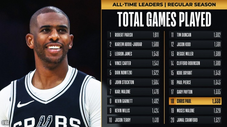 2025-03-02 09:32:20?保羅常規(guī)賽出場(chǎng)數(shù)達(dá)到1330場(chǎng) 超越摩西-馬龍獨(dú)占?xì)v史第18