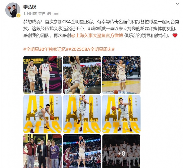 李弘權(quán)配文:“夢想成真!首次參加CBA全明星正賽,有幸與傳奇名宿們和跟各位球星一起同臺競技。這段經(jīng)歷我會永遠(yuǎn)銘記于心,非常感激一直以來支持我的粉絲和媒體朋友們。感謝我的團(tuán)隊(duì),再次感謝上海久事大鯊魚俱樂部的領(lǐng)導(dǎo)和教練們?!?/p>