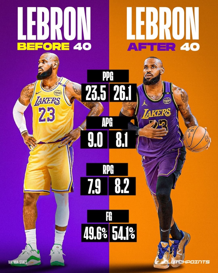 2025-03-04 22:38:05繼續(xù)逆!本季老詹40前場(chǎng)均23.5分7.9板9助 40后26.1分8.2板8.1助