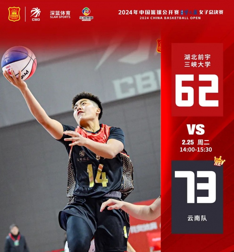 首場比賽由湖北前宇三峽大學(xué)對陣云南隊,上半場開局,兩隊打得相對膠著,比分緊咬至6平。隨后湖北前宇三峽大學(xué)加強防守,8號漆采籃下強勢,反擊中4號衛(wèi)香羽、5號陸婷接連籃下得分,湖北前宇三峽大學(xué)16-9領(lǐng)先。落后的云南隊,不斷通過外線尋找機會,14號娜漢三分命中,幫助球隊逐漸追平并反超比分。首節(jié)結(jié)束,云南隊22-20領(lǐng)先湖北前宇三峽大學(xué)。次節(jié),兩隊進攻火力不減,湖北前宇三峽大學(xué)5號陸婷依舊手感火熱,云南隊14號娜漢也不甘示弱。半場結(jié)束,云南隊39-37領(lǐng)先湖北前宇三峽大學(xué)。下半場,隨著體力的下降,兩隊進攻成功率都所有降低,湖北前宇三峽大學(xué)陷入短暫的得分荒,反觀云南隊在14號娜漢、6號羅菲的帶領(lǐng)下,多次反擊快攻得手,最終云南隊73-62戰(zhàn)勝湖北前宇三峽大學(xué)。