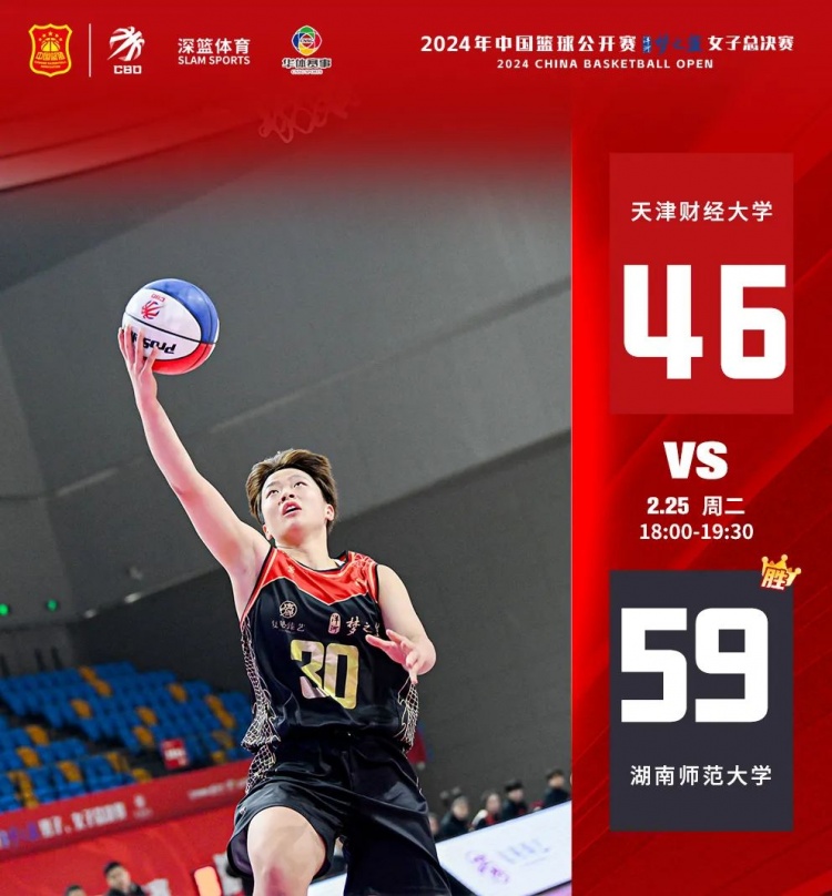 第三場比賽由天津財經(jīng)大學(xué)對陣湖南師范大學(xué),上半場比賽開始,兩隊便火藥粉十足,均表現(xiàn)出了強大的防守能力,首節(jié)天津財經(jīng)大學(xué)14-15湖南師范大學(xué)。次節(jié),天津財經(jīng)大學(xué)全員手感不佳,湖南師范大學(xué)趁勢打出一波得分的小高潮。半場結(jié)束,湖南師范大學(xué)38-22領(lǐng)先天津財經(jīng)大學(xué)。下半場,天津財經(jīng)大學(xué)及時調(diào)整,奮起直追。8號夏榮三分命中,天津財經(jīng)大學(xué)追至34-44,湖南師范大學(xué)穩(wěn)扎穩(wěn)打,最終湖南師范大學(xué)59-46戰(zhàn)勝天津財經(jīng)大學(xué)。
