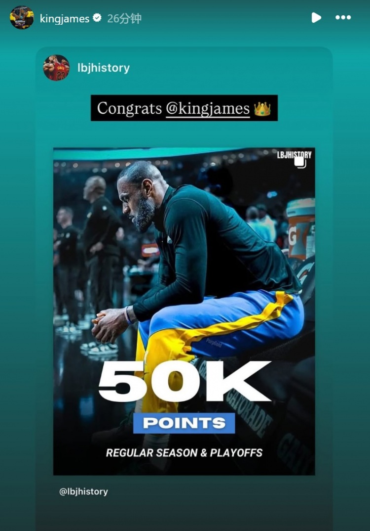 生涯50000分里程碑之夜!詹姆斯賽后轉(zhuǎn)發(fā)眾多祝福停不下來(lái)