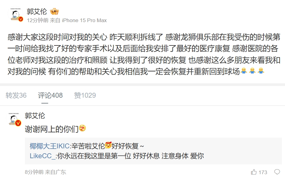 郭艾倫更博報(bào)平安:順利拆線了 我一定會(huì)恢復(fù)并回到球場(chǎng)!