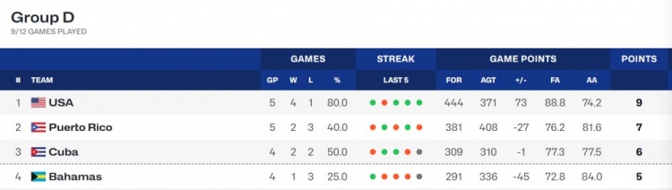 目前,美國男籃4勝1負積9分,暫時排在D組第一。