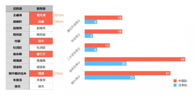 而與上一次亞預(yù)賽輸給日本隊(duì)相比,這次我們迎來了趙睿和周琦的回歸,并且多了2米07的高大鋒線曾凡博。正因?yàn)橛羞@些能在對位中占據(jù)絕對體型優(yōu)勢的球員加入,我們才有了這次42分的大勝。