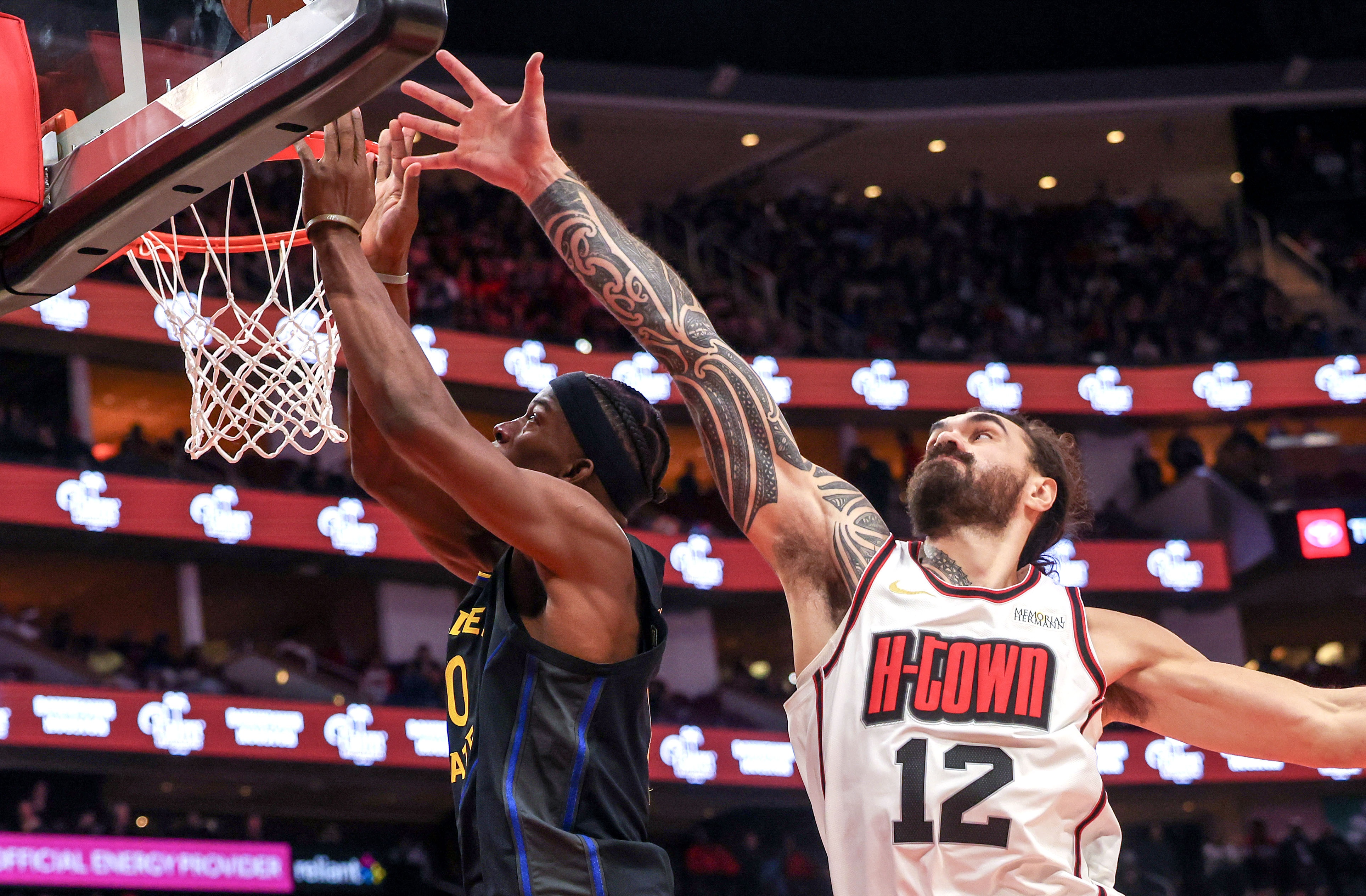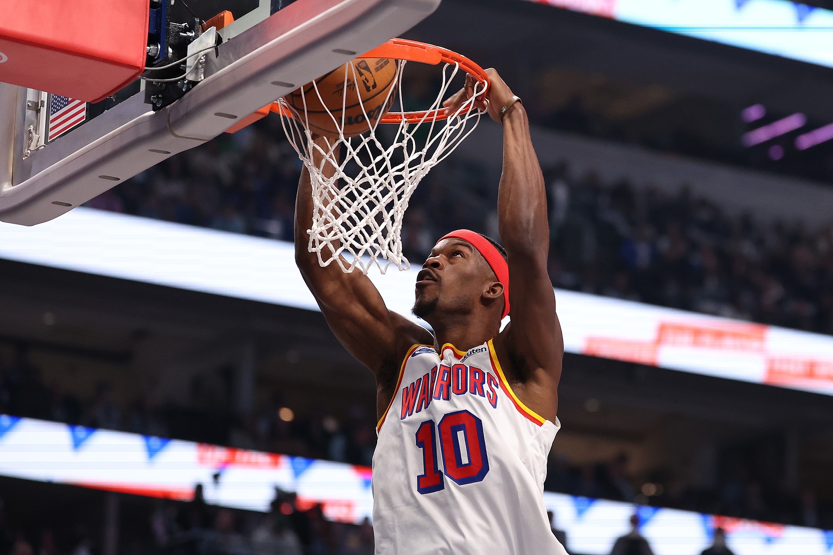 巴特勒并沒有用超級(jí)巨星的表現(xiàn)壓倒對(duì)手,在勇士隊(duì)他場(chǎng)均可以得到還算不錯(cuò)的16.3分、5.3個(gè)籃板、5.3次助攻和1.1次搶斷,上場(chǎng)時(shí)間為30.6分鐘。(我說“還算不錯(cuò)”是因?yàn)楸举惣局挥?3名其他球員達(dá)到這些數(shù)據(jù),除了德斯蒙德-貝恩,其他人都至少入選過一次全明星。)巴特勒在投籃方面的表現(xiàn)很掙扎——自從交易以來,他20次三分球出手投丟了18個(gè),在油漆區(qū)的投籃命中率僅為53.3%,低于本賽季早些時(shí)候在邁阿密熱火隊(duì)時(shí)的61.2%——而且在過去的幾場(chǎng)比賽中有所下滑,部分原因是背部痙攣,部分原因是整體進(jìn)攻停滯。