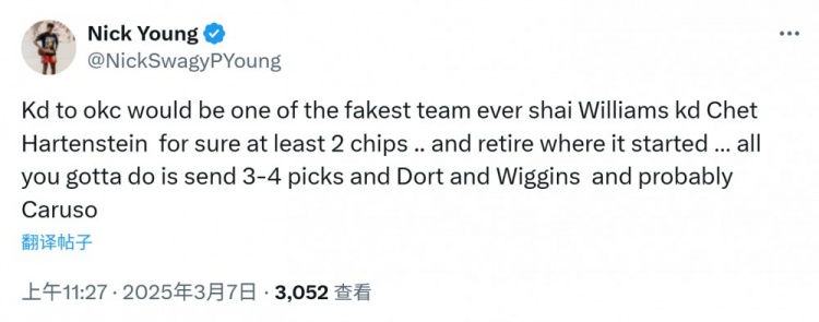 2025-03-07 15:27:41尼克-楊:杜蘭特若回雷霆至少能拿兩冠 還能在夢開始的地方退役