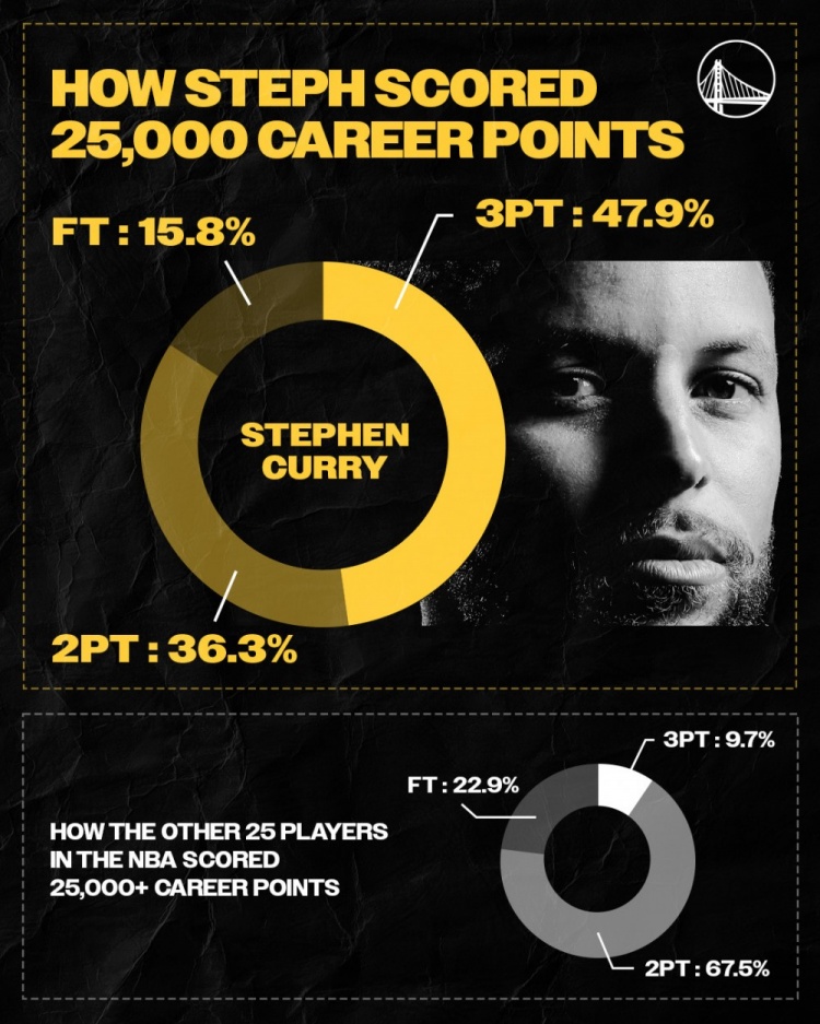獨樹一幟!庫里25000分中得分方式占比:三分47.9% 罰球僅15.8%