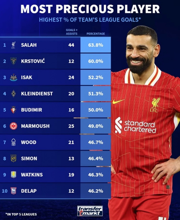 3月11日訊 《轉(zhuǎn)會(huì)市場(chǎng)》統(tǒng)計(jì)了本賽季五大聯(lián)賽直接參與進(jìn)球占全隊(duì)總進(jìn)球的比率情況,薩拉赫無懸念居首,已經(jīng)轉(zhuǎn)會(huì)曼城的馬爾穆什依然是法蘭克福隊(duì)內(nèi)最高。