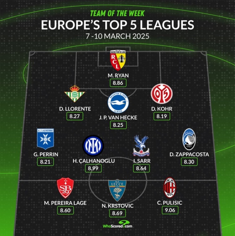 2025-03-12 10:01:18whoscored本周五大聯(lián)賽最佳陣:普利西奇&恰20領(lǐng)銜,袋鼠國門在列