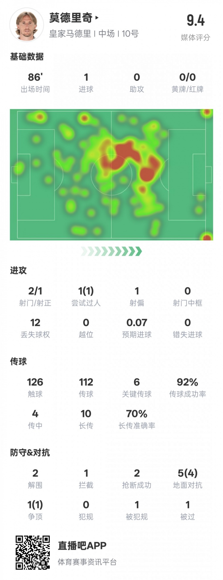 2025-02-24 16:11:56莫德里奇本場比賽數(shù)據(jù):1進(jìn)球6關(guān)鍵傳球2解圍2搶斷,評分9.4