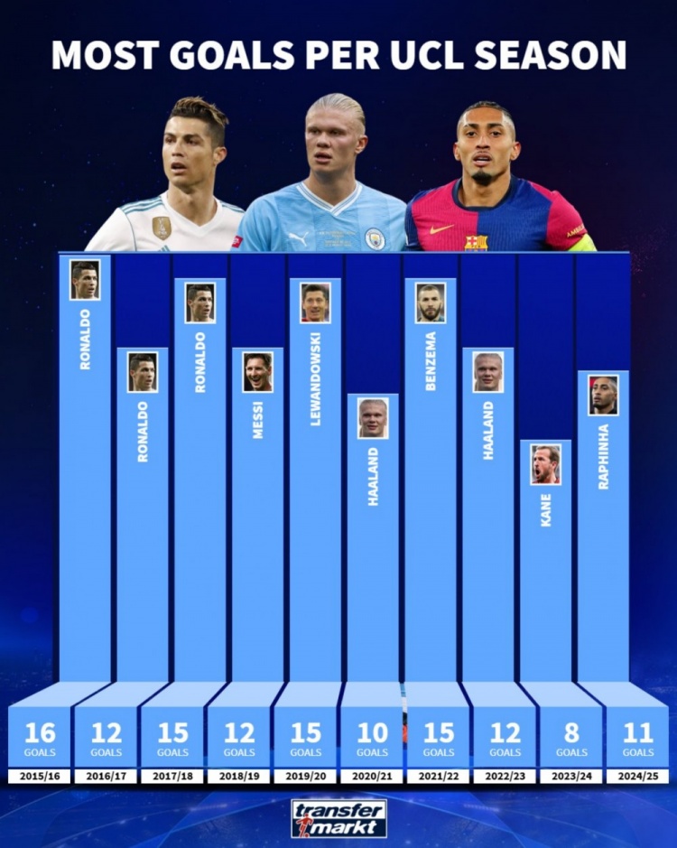 2025-03-12 22:03:05德轉(zhuǎn)列近10個(gè)賽季歐冠進(jìn)球紀(jì)錄:C羅16球最多,拉菲尼亞已11球