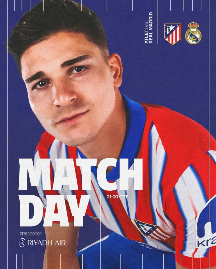 馬競方面也發(fā)布海報,上一場兩隊交手時取得進(jìn)球的阿爾瓦雷斯單人出鏡,右上角為對陣雙方隊徽。