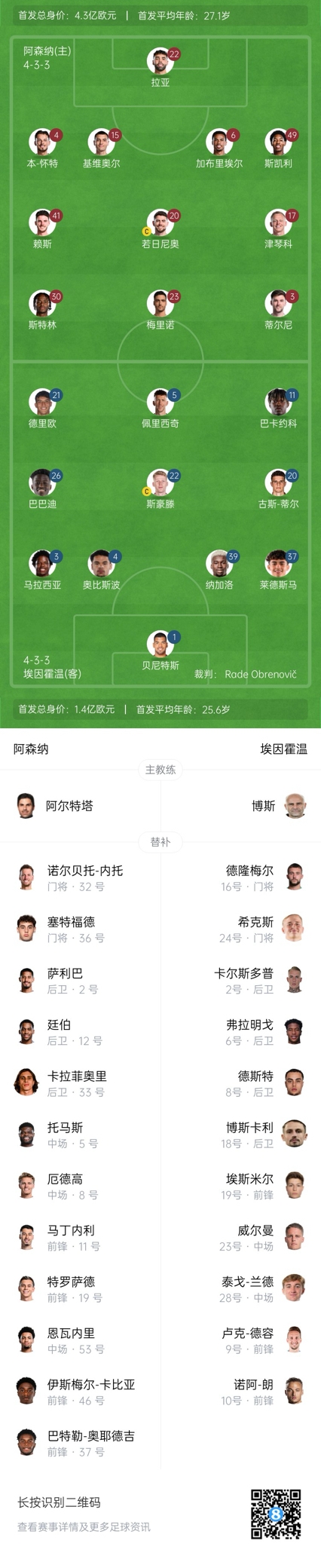 阿森納替補:32-內(nèi)托、36-塞特福德、2-薩利巴、12-廷伯、33-卡拉菲奧里、5-托馬斯、8-厄德高、53-恩瓦內(nèi)里、11-馬丁內(nèi)利、19-特羅薩德、37-奧耶德吉、46-卡比亞