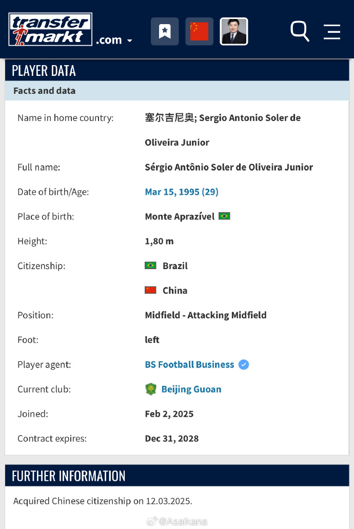朱藝寫道:原籍巴西的北京國安球員塞爾吉尼奧已經(jīng)完成了中國入籍手續(xù),成為了一名中國公民。轉(zhuǎn)會市場網(wǎng)已經(jīng)根據(jù)相關(guān)情況,將中國國旗添加到了他的資料中。待他上演中國國家隊首秀時,我們將會把他的“第一會籍”改為中國。