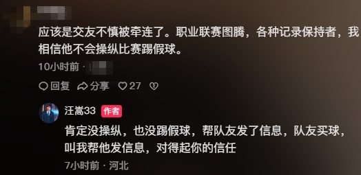 2025-03-13 14:34:15汪嵩再回評論:肯定沒操縱也沒踢假球,隊友買球叫我?guī)退l(fā)信息