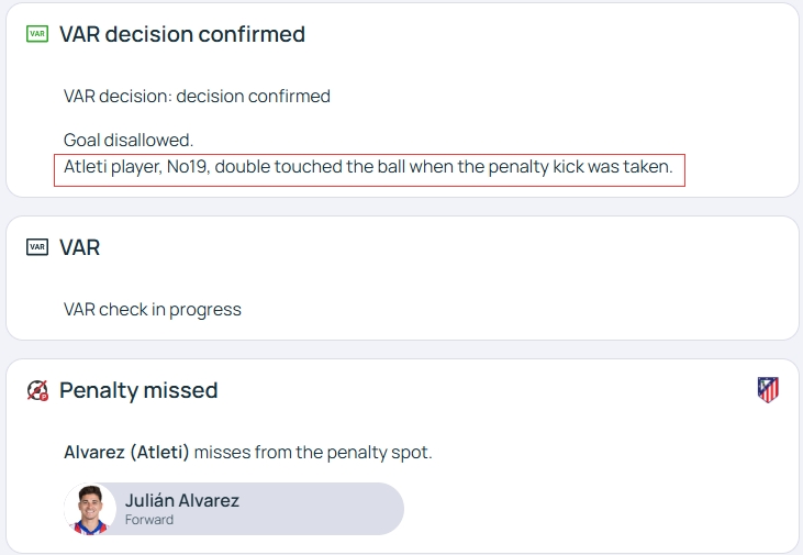 歐冠官網(wǎng)對(duì)此的解釋為:VAR判決確定,進(jìn)球無效。馬競(jìng)19號(hào)球員(阿爾瓦雷斯),罰點(diǎn)時(shí)兩次觸球。