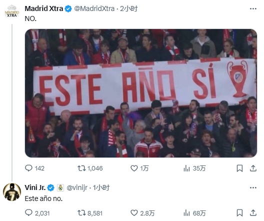 2025-03-13 14:35:58馬競球迷舉橫幅:歐冠就今年了!維尼修斯社媒評論:今年已無