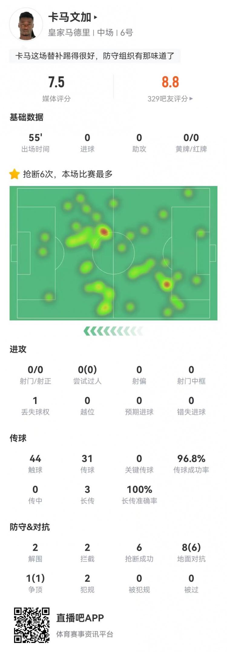 2025-03-13 14:40:41卡馬文加替補9對抗7成功+6搶斷2解圍2攔截 3長傳3成功 獲7.5分