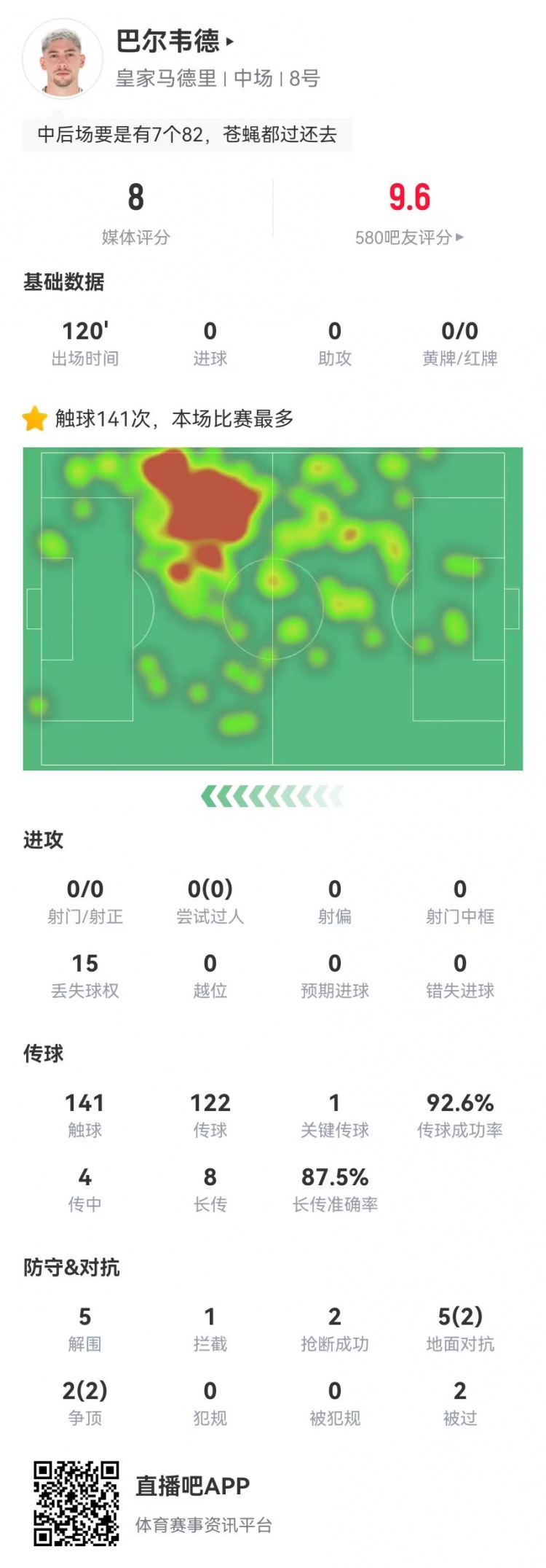 巴爾韋德本場5解圍2搶斷2被過 8長傳7成功+1點(diǎn)球大戰(zhàn)進(jìn)球 獲8.0分