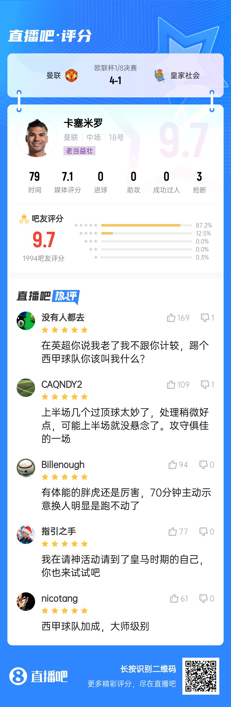歐聯(lián)1/8決賽次回合,曼聯(lián)4-1戰(zhàn)勝皇家社會(huì)??ㄈ琢_本場(chǎng)比賽首發(fā)出戰(zhàn)79分鐘,表現(xiàn)出色,賽后吧友給他打出9.7分的高分。