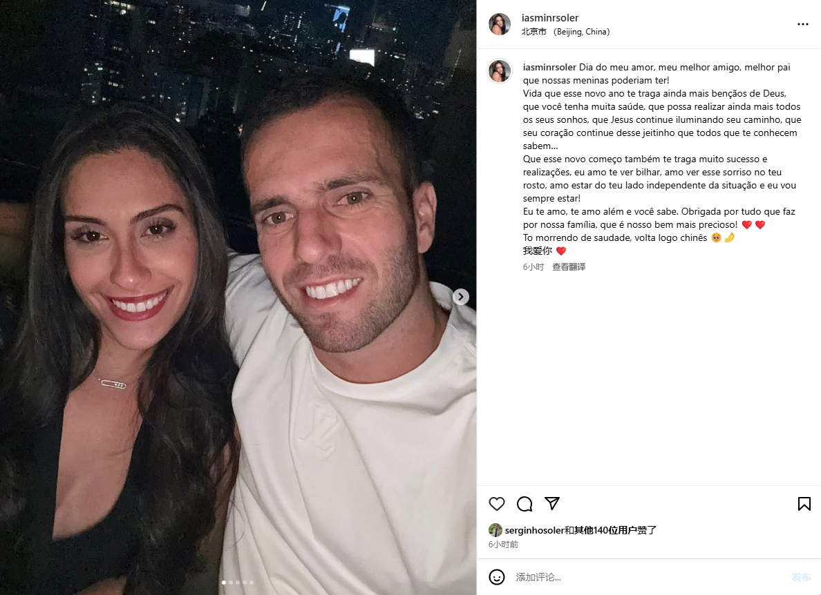03月15日訊 今天是新晉歸化國腳塞爾吉尼奧的30歲生日,塞爾吉尼奧的妻子伊亞斯敏在社媒上用葡語和中文深情告白丈夫。