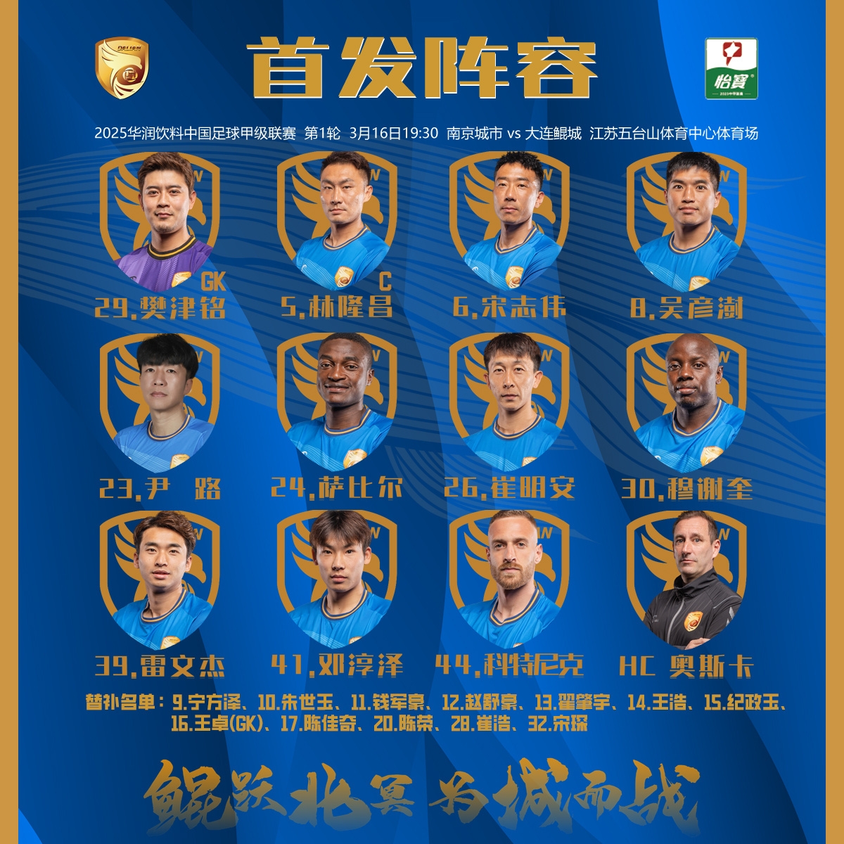 2025-03-16 21:28:512025賽季中甲聯(lián)賽首輪,大連鯤城客場對陣南京城市首發(fā)出爐!