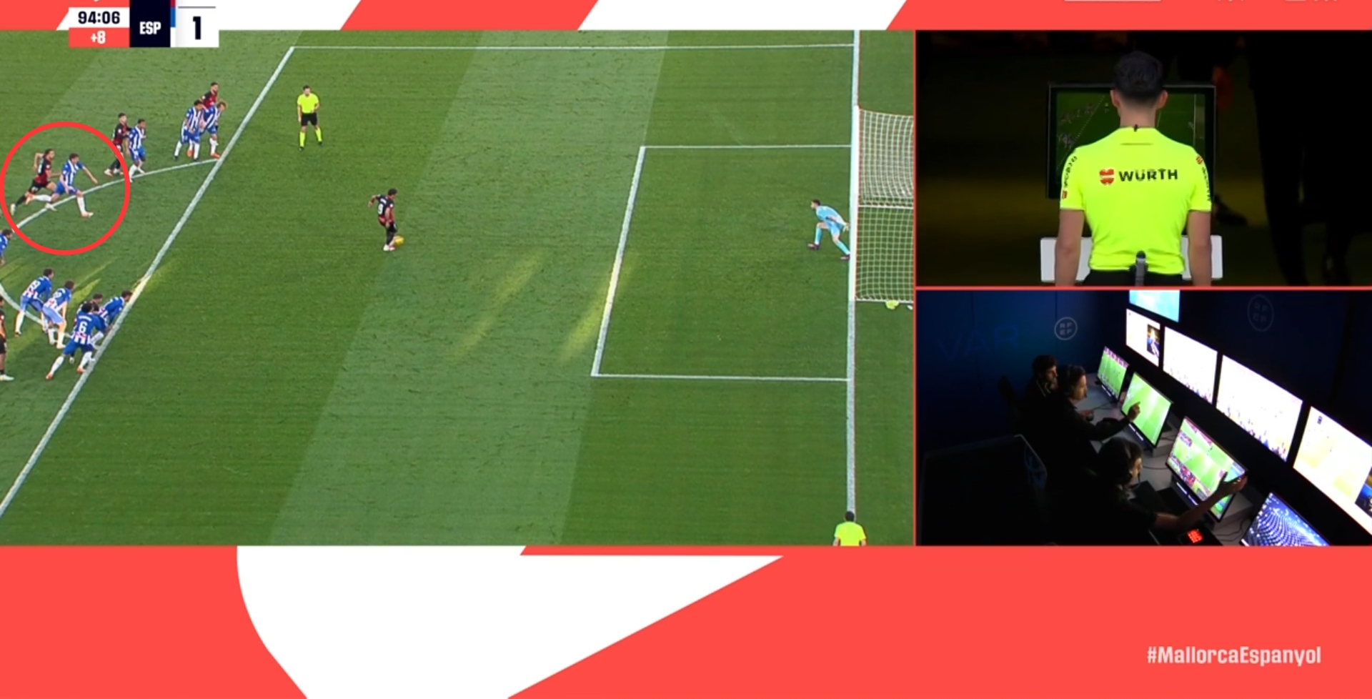 第92分鐘,VAR介入,主裁親自查看回放,此前西班牙人球員和馬略卡球員同時提前進(jìn)入禁區(qū)?。ň嚯x點球點不滿9.15米),并對比賽產(chǎn)生影響,主裁判罰點球重罰↓