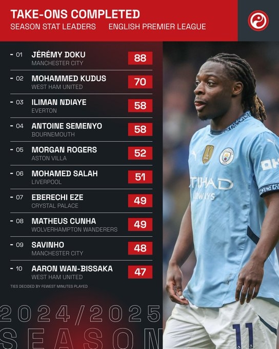2025-03-18 08:24:49本賽季英超成功過人榜:多庫88次獨自領(lǐng)跑,薩拉赫、薩維尼奧在列