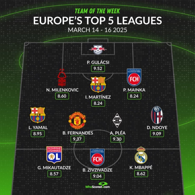 2025-03-18 08:25:11whoscored本周五大聯(lián)賽最佳陣:B費(fèi)領(lǐng)銜,姆巴佩、亞馬爾在列