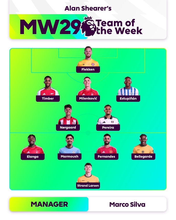 中場(chǎng):諾爾高(布倫特福德)、佩雷拉(富勒姆)、伊蘭加(諾丁漢森林)、馬爾穆什(曼城)、B費(fèi)(曼聯(lián))、貝萊加德(狼隊(duì))