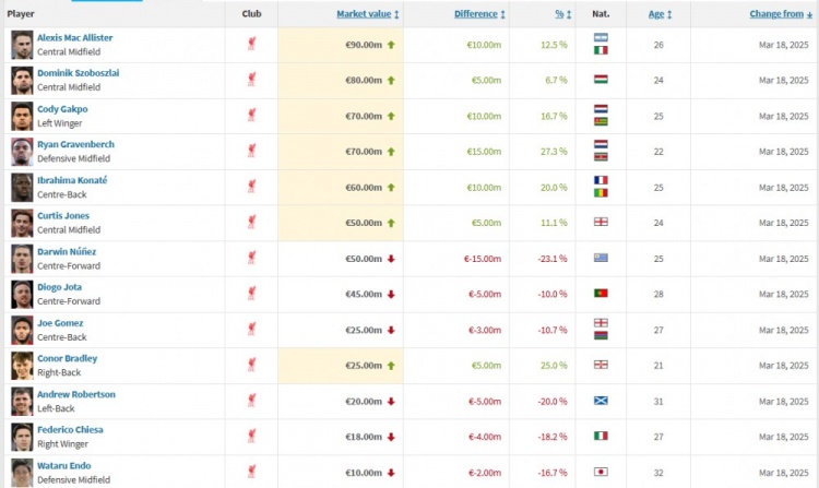 2025-03-18 21:09:05利物浦身價更新:“麥8赫”組合均上漲,努涅斯下跌1500萬歐