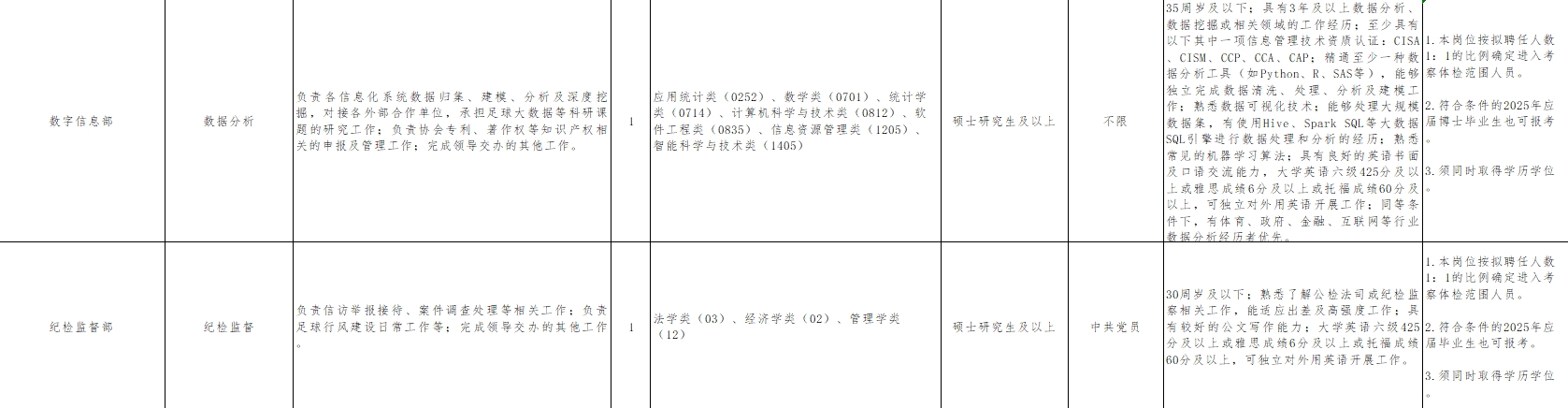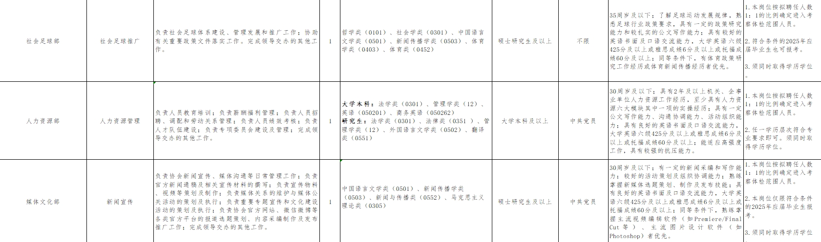 另外,綜合部(財務審核)、國家隊管理部(隊伍管理)、裁判部(裁判管理)、社會足球部(社會足球推廣)、媒體文化部(新聞宣傳)、數(shù)字信息部(數(shù)據(jù)分析)、紀檢監(jiān)督部(紀檢監(jiān)督)要求學歷為碩士研究生及以上,其余崗位為大學本科及以上。