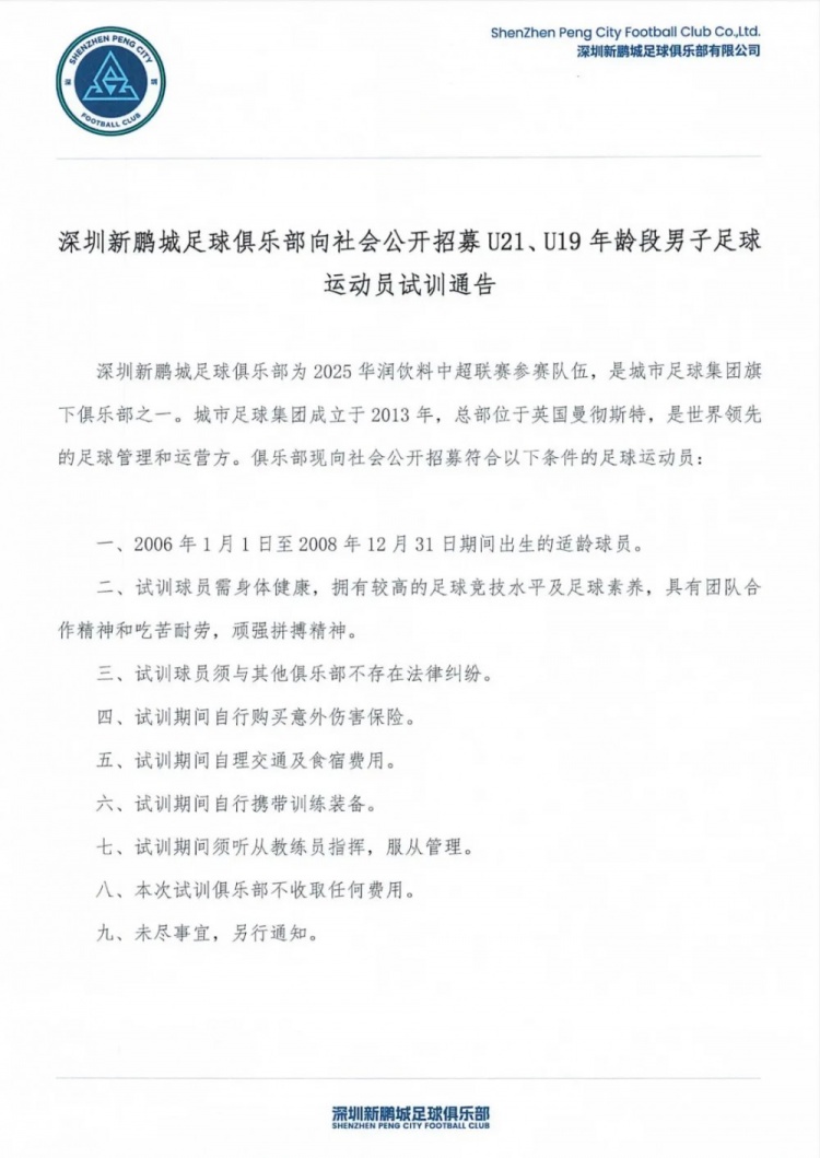2025-03-19 16:44:16深圳新鵬城招募U21、U19、U17年齡段男子足球運(yùn)動員試訓(xùn)通告