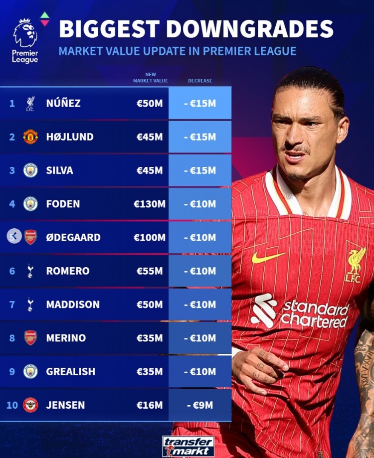 2025-03-19 16:59:49英超球員貶值榜:努涅斯&霍伊倫&B席均降1500萬,福登&厄德高在列